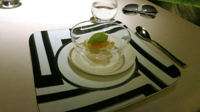 [Hamachi’s Tiradito with cherries and a cucumber’s snow]