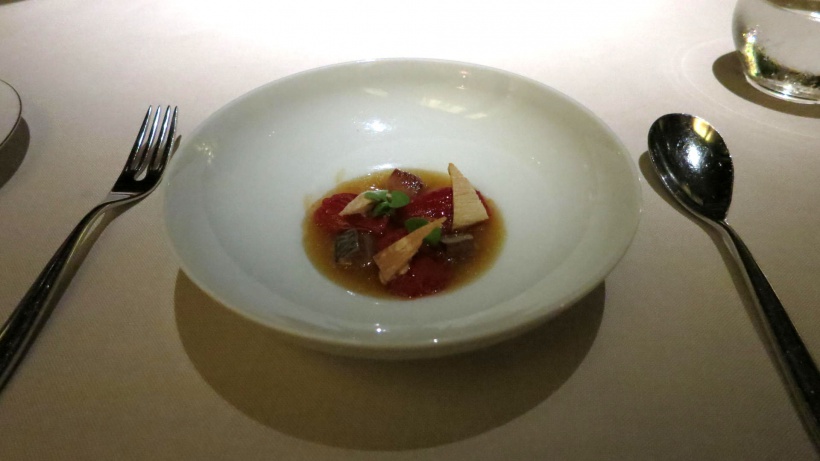 [candied tomatoes, pepper’s water with olive oil,smoked sardine, an anchovies “coladura”, bread skin and basil]